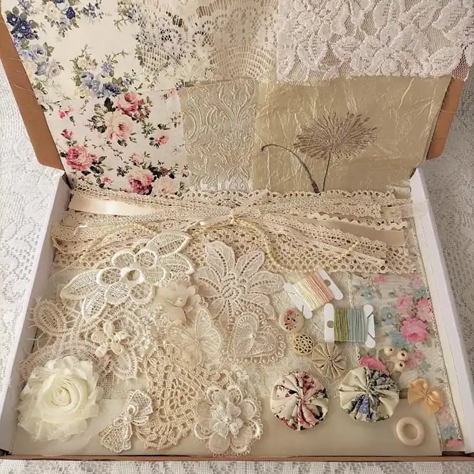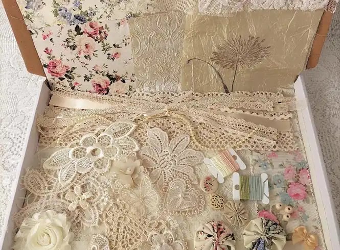 Curated boxes of new and reclaimed fabrics, threads, lace trim and motifs for a mindful, meditative hand-sewing practice known as slow stitching. Focusing on the calming process, not perfection, this process allows for creative freedom to make unique textile art and fabric collages. These kits, handpicked and assembled by Fibreandstitch offer everything needed for you to relax and enjoy the therapeutic rhythm of stitching without complex patterns, making it an accessible, stress-relieving craft.